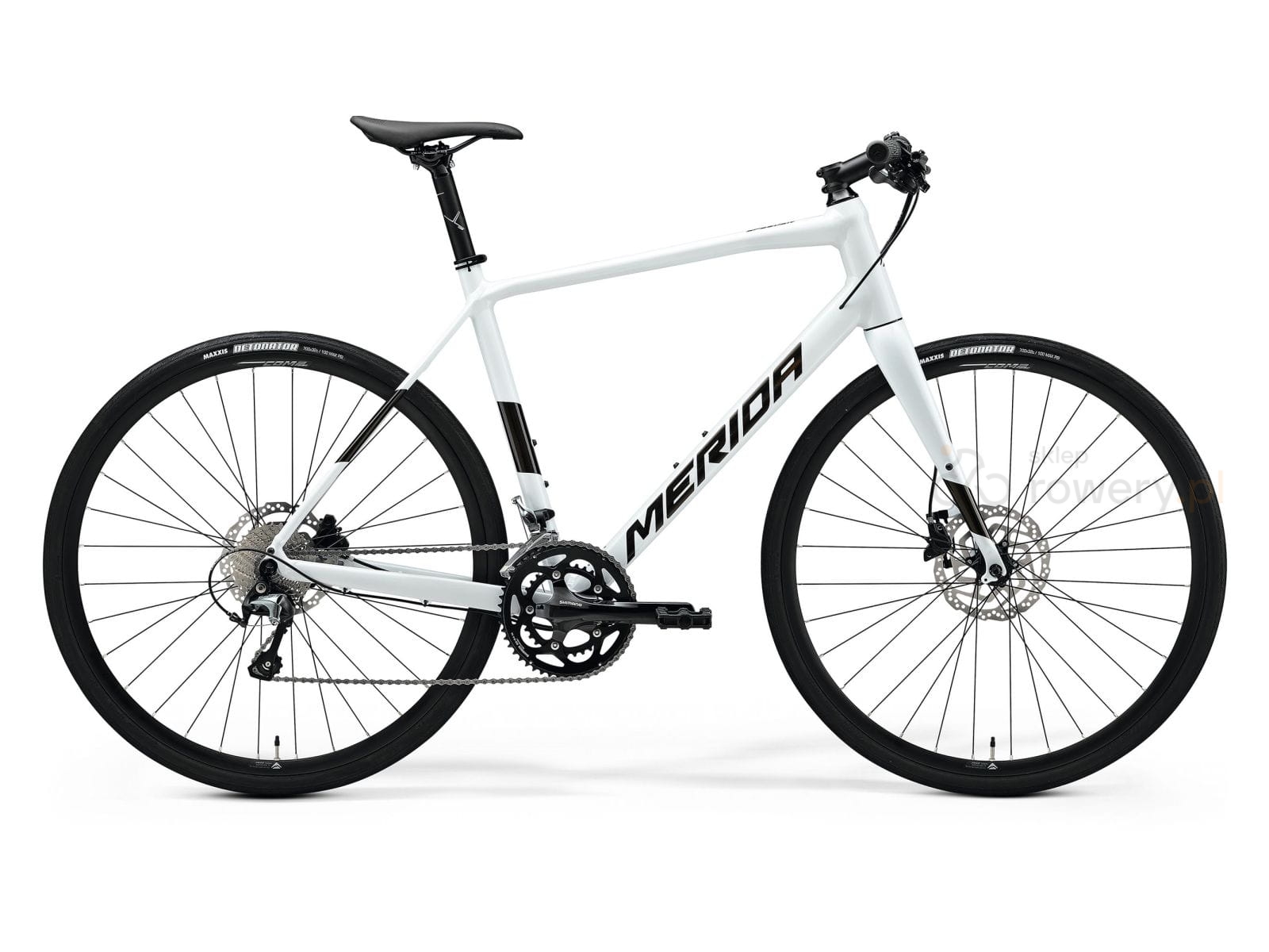 Napęd Shimano Tiagra 2 × 10 oferuje odpowiedni zakres przełożeń i wysoką kulturę pracy, sprawdzając się zarówno podczas dynamicznej jazdy po asfalcie, jak i na bardziej wymagających odcinkach. Hydrauliczne hamulce tarczowe Shimano MT200 gwarantują skuteczne i pewne hamowanie w każdych warunkach pogodowych. Opony Maxxis Detonator o szerokości 32 mm zwiększają przyczepność i bezpieczeństwo, nie rezygnując z szybkości toczenia.